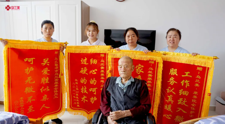 原來,李爺爺家屬口中的護士和護理人員們都在烏蘭美康養(yǎng)院工作,她們用過硬的專業(yè)知識和嫻熟的照護技能,對入院的長者進行專業(yè)護理,用細心、耐心、愛心、責(zé)任心陪伴左右,不怕苦、不怕累,盡職盡責(zé)的為長者緩解消除恐懼、焦慮和陌生感,減輕身心痛苦。她們待長者如親人的用心照料,讓李爺爺家屬十分感動,所以連送四面錦旗,以表誠摯的感謝。