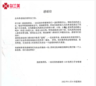隨著錦旗一起送進(jìn)來的還有一封致謝烏蘭美康養(yǎng)院全體工作人員的感謝信,來信人是在康養(yǎng)院入住的張秀蘭奶奶的子女,他們?cè)谛胖懈兄x工作人員對(duì)張奶奶的悉心呵護(hù)、專業(yè)照顧、辛勤付出和陪伴,更稱贊康養(yǎng)院為所有的老人提供了一個(gè)幸福溫暖的大家庭,最后祝愿康養(yǎng)院的明天更加輝煌。