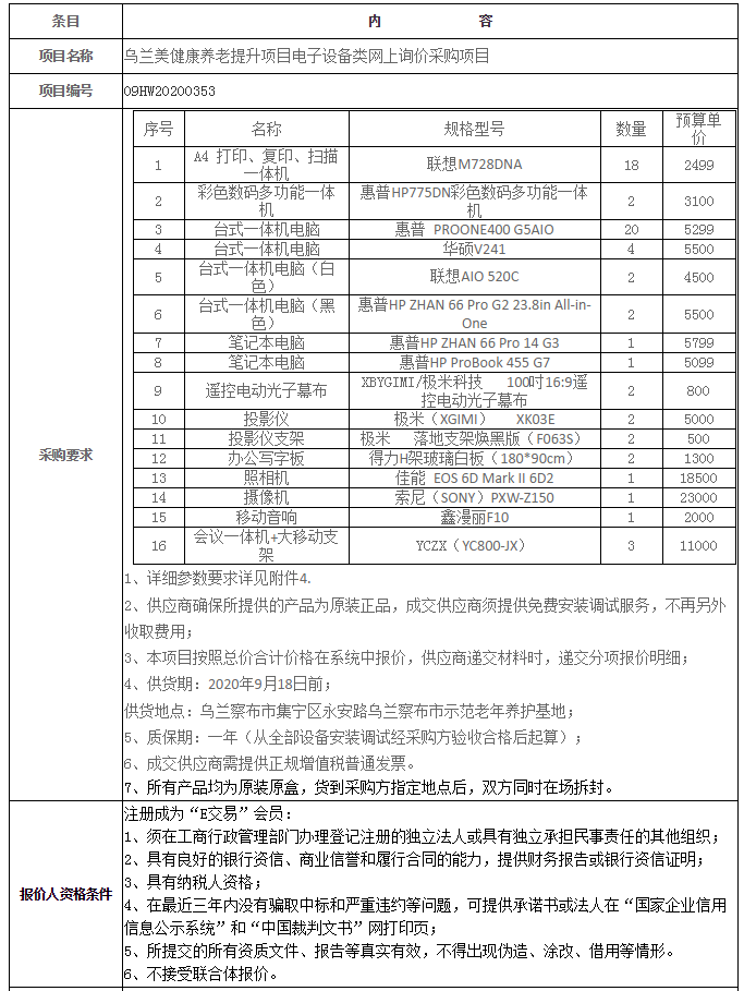 烏蘭美健康養(yǎng)老提升項目電子設備類網(wǎng)上詢價采購項目發(fā)布時間: 2020-09-01 -